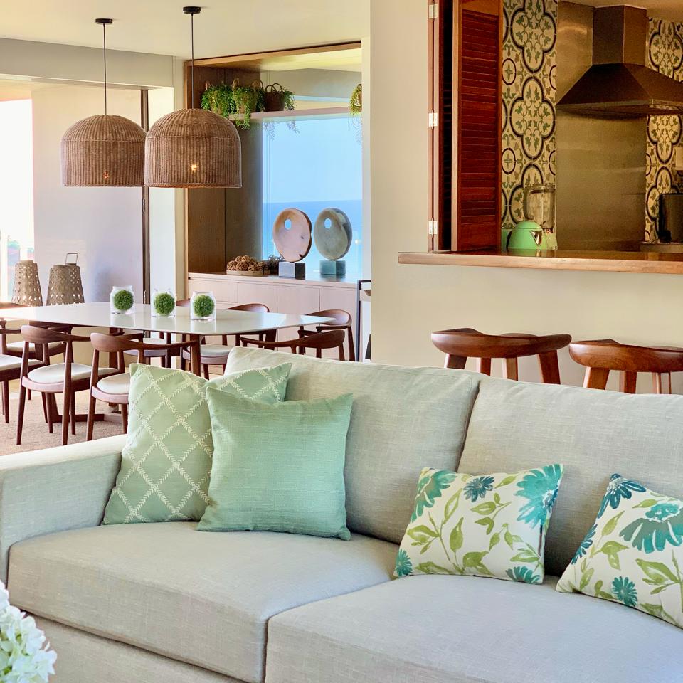 En este proyecto de interiores se cuidaron todos los detalles que decoran los espacios, logrando armonía en cada rincón. Es un interiorismo fresco y elegante para el que se tomaron en cuenta la hermosa vista del mar y la vegetación teniendo como resultado una integración entre el espacio y el entorno natural.